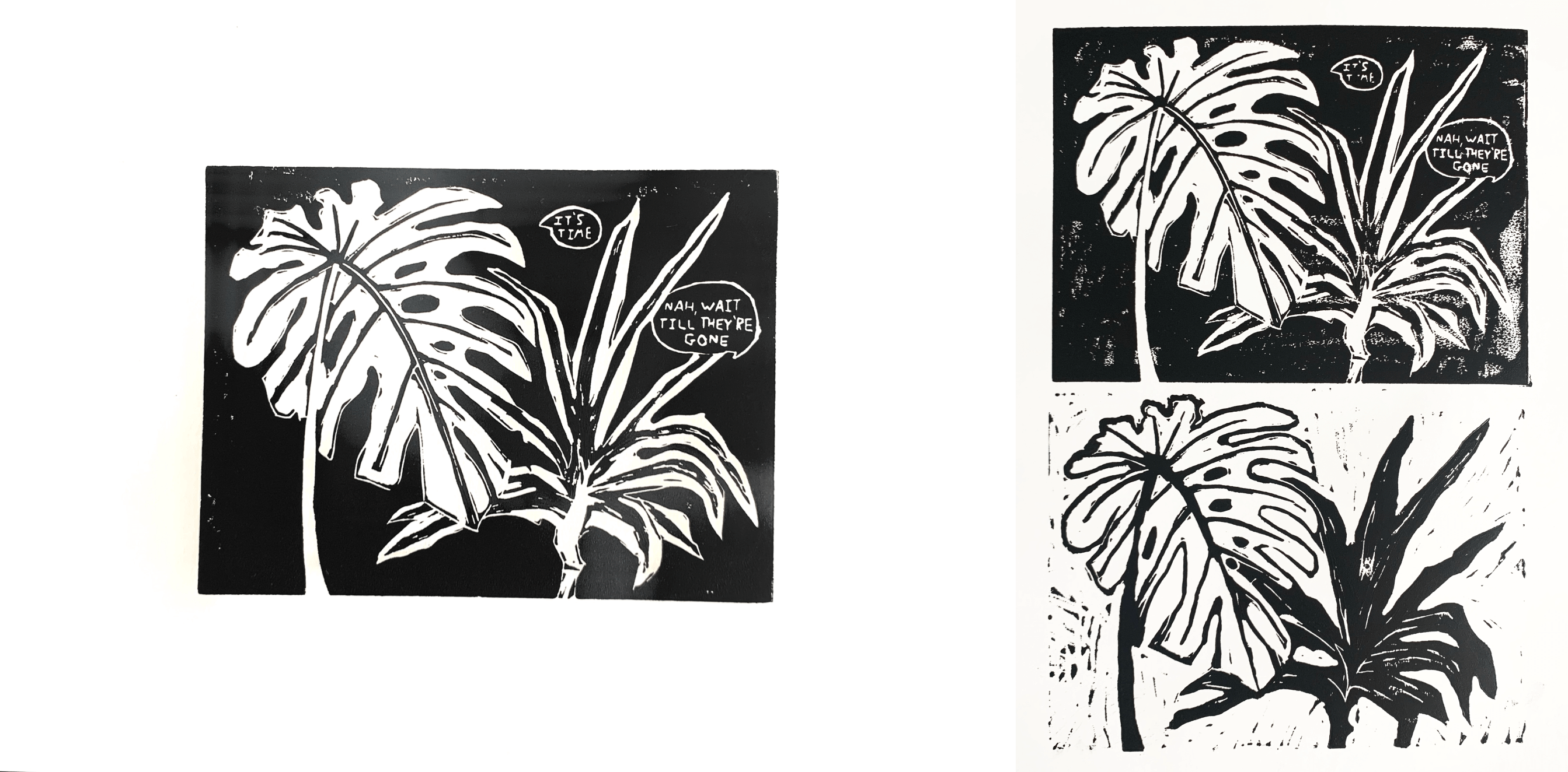 printmaking has always been one of my favorite ways to make art. i also really like totoro (i've watched it over 50 times). as an homage to the way ススワタリ took over my mind as a little kid, i took over the walls of an art studio with these little linoleum stamps i made.